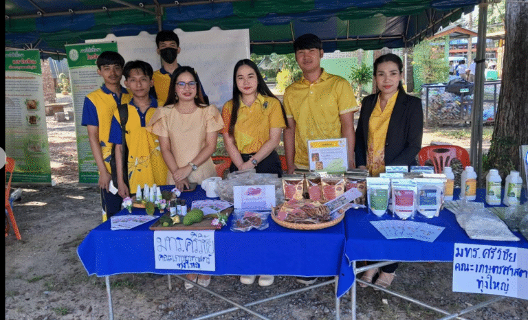 On December 9, 2022, from 08:00 AM to 09:00 AM, the Faculty of Fisheries Science and Technology organized an agricultural and fisheries product market on the 1st floor of the Chaloem Phra Kiat Building. Products available for sale included various local and non-toxic agricultural and fisheries products such as pearl spot fish, orange-spotted grouper, pesticide-free vegetables, shrimp paste, hand-ground curry paste, jasmine rice, spicy Thai salad, and Thai desserts. Additionally, there was a promotion of online sales through Facebook Live.