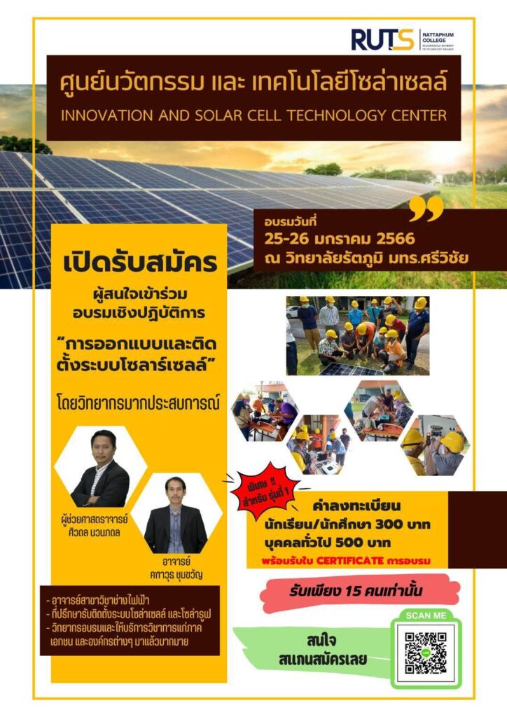The training sessions will be held in two batches: the first on January 25-26, 2023, and the second on January 28-29, 2023, at the Solar Cell Innovation and Technology Center, Rattaphum college, Building 10, Rajamangala University of Technology Srivijaya, Songkhla Province.