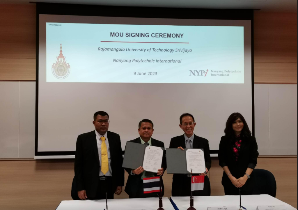 In addition, on June 9th ,2023, Prof. Dr Suwat Tanyaros, the President, Asst.Prof. Sutep Cookli, Vice President, and Mrs. Saritorn Madman, Director of Personal Administration Division, RUTS and Dr Henry Heng, the CEO of Nanyang Polytechnic International, Singapore, presides over the Memorandum of Understanding (MoU) signing ceremony between RUTS and NYPi for Partnership for the Goals.
