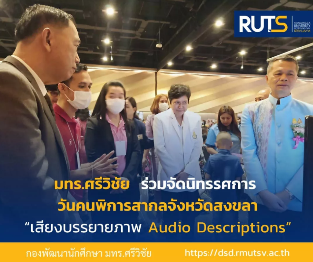 Moreover, Rajamangala University of Technology Srivijaya (RUTS) participated in the exhibition showcasing innovations in “Audio Descriptions” at the International Day of Persons with Disabilities event in Songkhla province. The event was held on December 3, 2023, at Hatyai Hall (5th floor, Central Festival, Hatyai). The exhibition featured innovations in media accessibility for individuals with disabilities.