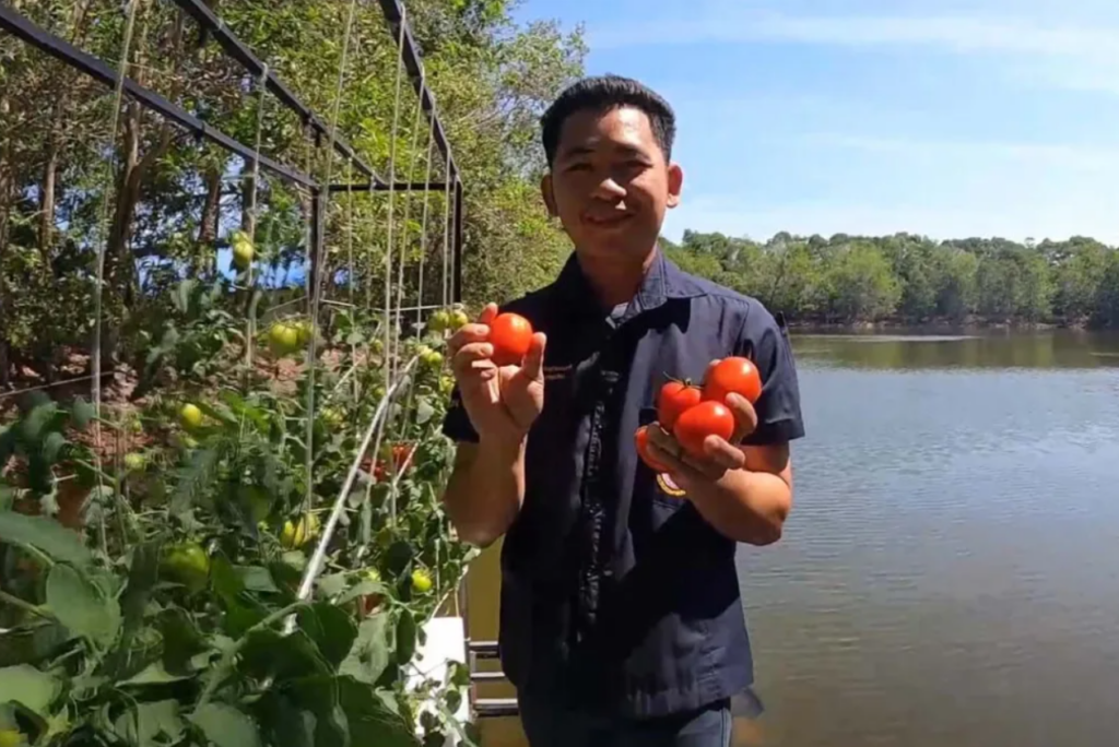 The students conducted experiments growing hydroponic vegetables and tomatoes, alongside fish farming, in cages on a 6×6 meter floating platform. They constructed the floating platform in about 15 days during their free time, primarily using repurposed materials, keeping the total construction cost, including the installation system, to approximately 28,000 THB.