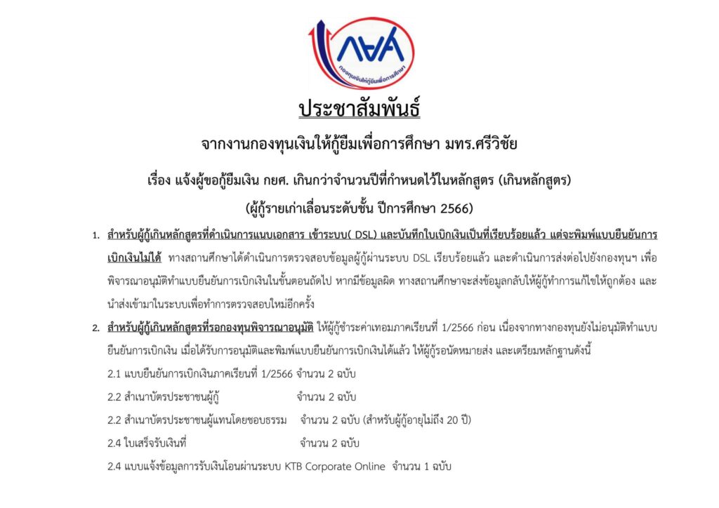Rajamangala University of Technology Srivijaya The Student Loan Fund ( SLF ) is supported to help students from low-income families. To provide equal access to higher education The Student Loan Fund plays an important role in helping students in the bottom 20% of income groups have the opportunity to continue their studies without worrying about financial burdens . And also promote them to have the opportunity to graduate with confidence. The university provides training and advice on how to properly access and use the fund. Help students make full use of this fund.