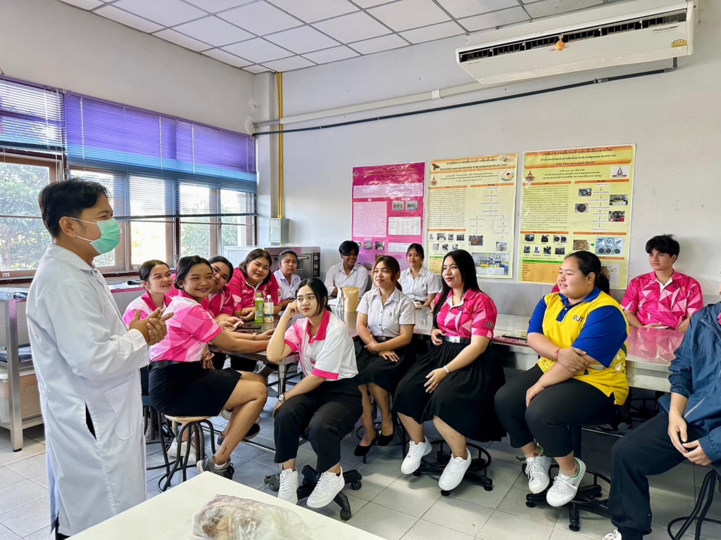 Students in the Food Management and Services program are participating in practical lessons for the course “Principles of Cooking,” taught by Dr. Sutthasinee Thongnork. They are also enrolled in the course “Innovations in Insect-Based Products,” led by Associate Professor Dr. Supasit Chooklin, with assistance from Mr. Teerapong Muangsi and Mr. Uthen Na Phatthalung.
