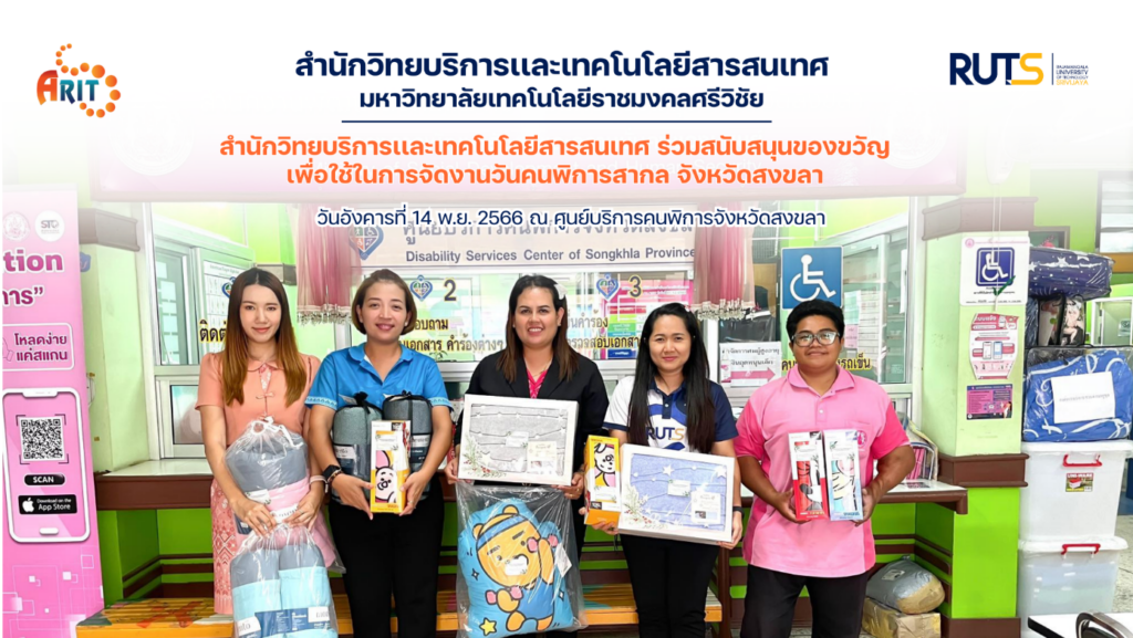On November 14, 2023, executives and staff from the Office of Academic Resources and Information Technology (ARIT) supported the contribution of gifts for the International Day of Persons with Disabilities event in Songkhla Province. Associate Professor Sitthichoke Ounkaew, Director of ARIT, assigned Ms. Warunee Chongkonsri (Head of Office), Ms. Alipriya Rakklai, and Ms. Jantima Janchampa (General Administration Division) to present the gifts at the Songkhla Provincial Disability Service Center.