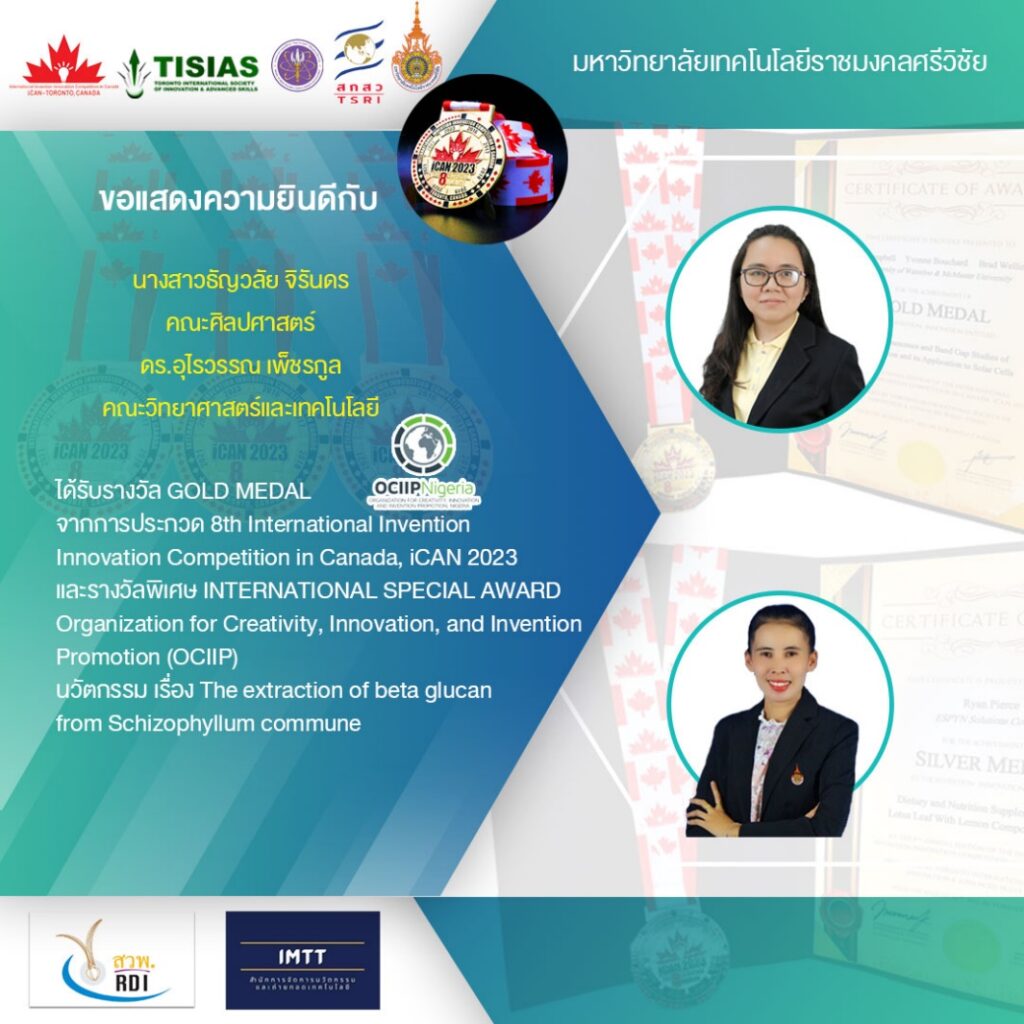 Asst. Prof. Thanwalai Jirandorn from the Faculty of Liberal Arts and Asst. Prof. Dr. Uraiwan Phetchakun from the Faculty of Science and Technology received the GOLD MEDAL award from the 8th International Invention Innovation Competition in Canada, iCAN 2023, via online format. Additionally, they received a special award from the Organization for Creativity, Innovation, and Invention Promotion (OCIIP) for their innovative work on “The extraction of beta glucan from Schizophyllum commune” The innovation in extracting substances was transferred to the Tha Kham Community Enterprise Group, Hat Yai District, Songkhla Province. The said enterprise group took the knowledge gained from the extraction process to develop it into products and distribute them to generate income.