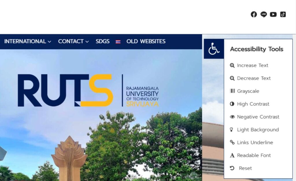 Rajamangala University of Technology Srivijaya has updated its website by adding Accessibility Tools, a set of features designed to assist individuals with physical, auditory, visual, or learning challenges in accessing technology and information more easily. These tools are designed to enhance usability and inclusivity for people with disabilities as follows: