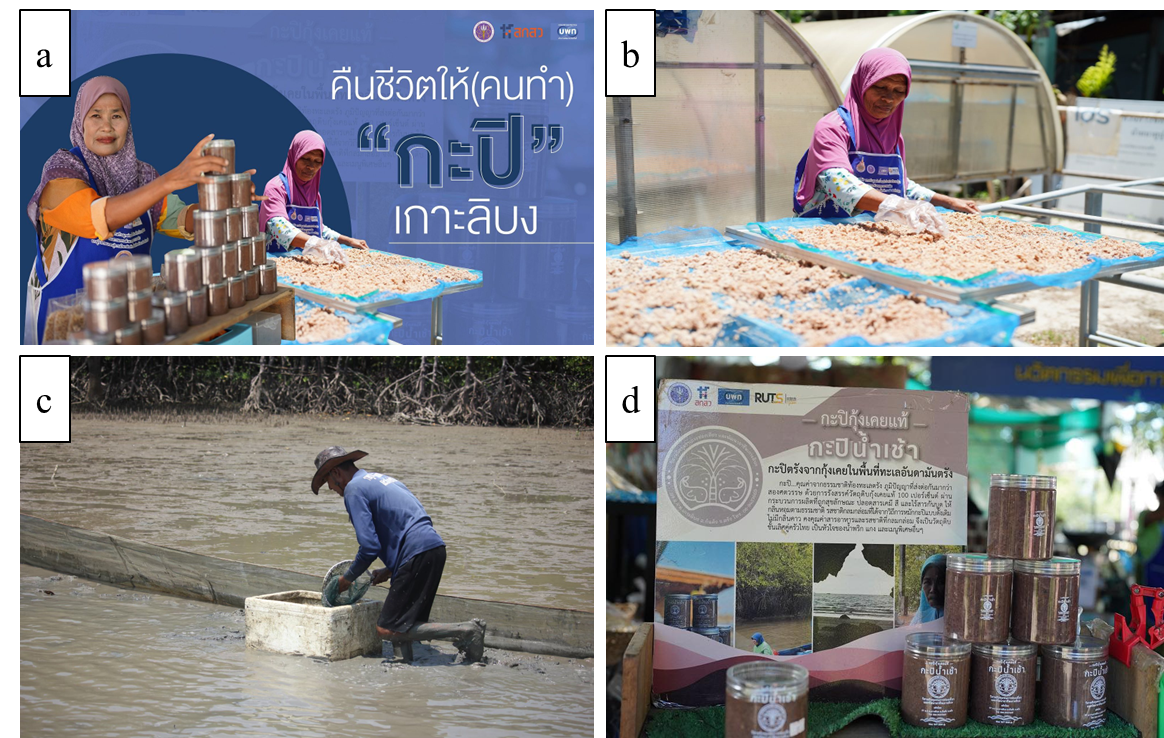 Figure 1. Commercial development of Trang shrimp paste (Kapi): (a) Selling Trang shrimp paste (Kapi) in the Koh Libong community; (b) Drying of shrimp in the processing process; (c) Finding shrimp in Trang Sea; (d) Trang shrimp paste (Kapi) from Trang developed from research.