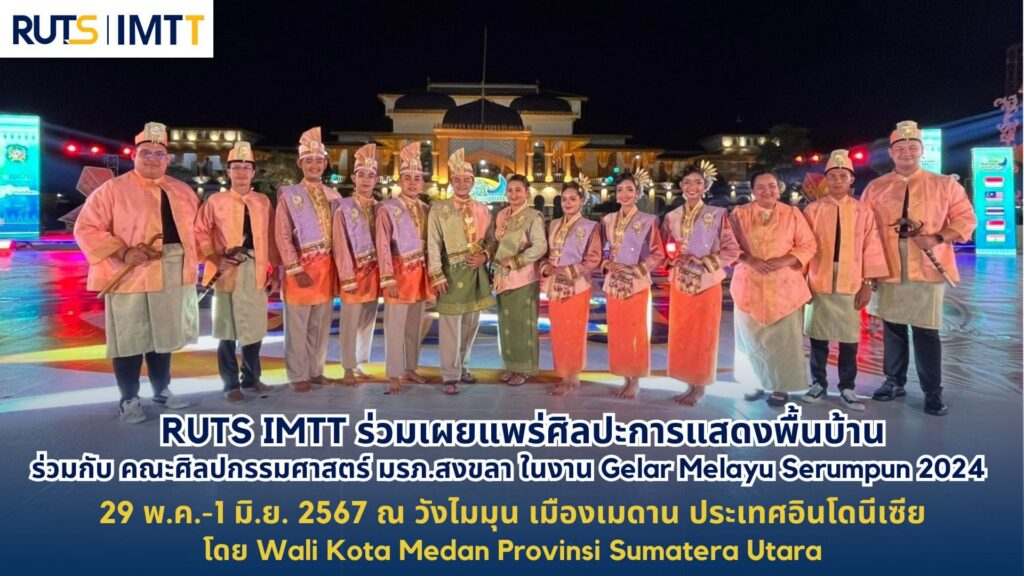 The Office of Innovation Management and Technology Transfer, RUTS, participated in the “Gelar Melayu Serumpun 2024” festival held in Medan, North Sumatra, Indonesia, from May 29 to June 1, 2024. The participation was part of a cultural collaboration between RUTS, Songkhla Rajabhat University’s Faculty of Fine and Applied Arts, and the Government of Medan City (Wali Kota Medan).