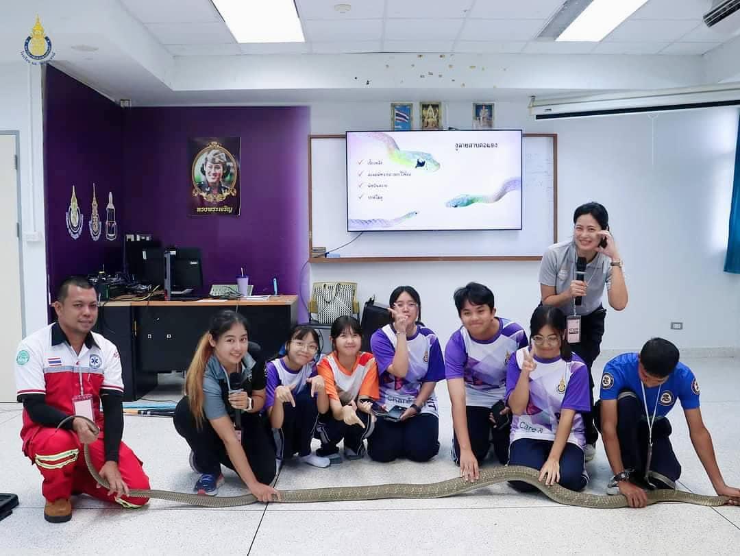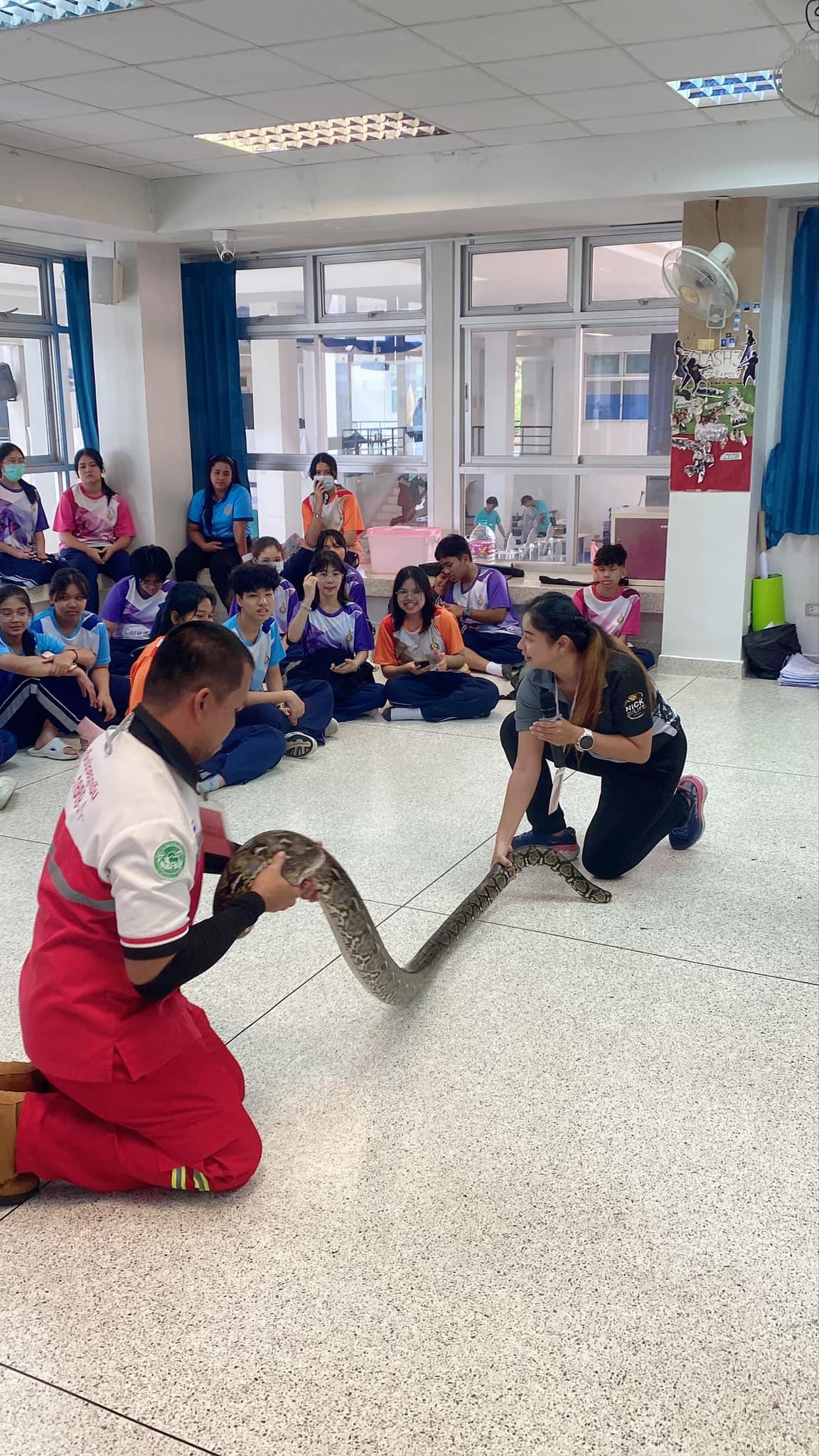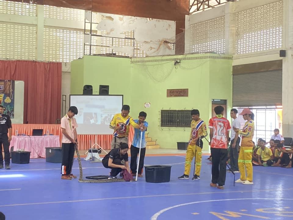 A second activity with a similar focus was organized at Thung Song Wittaya School, Nakhon Si Thammarat Province. Like the first program, this event introduced students to the ecological importance of snakes and their role in biodiversity. The lessons on venomous snake classification were repeated, ensuring that students understood the risks associated with different species. The venom system was again explained with clear examples, reinforcing scientific knowledge about how toxins affect humans and prey. Demonstrations of safe behavior during snake encounters were provided, with teachers and trainers guiding students step by step. Emphasis was placed on keeping calm, avoiding unnecessary harm to snakes, and contacting trained personnel for help. Students practiced basic first aid knowledge for snakebite, which is a critical life skill in rural and suburban areas. The activity was designed to be interactive, encouraging students to ask questions and share their experiences with snakes. By repeating these activities in multiple schools, the project reached a broader audience and built consistency in learning outcomes. The success of the Thung Song Wittaya program reflected the strong interest of students in both safety and biodiversity. Together, both activities strengthened the message that snakes should be respected as valuable parts of nature rather than feared without reason.