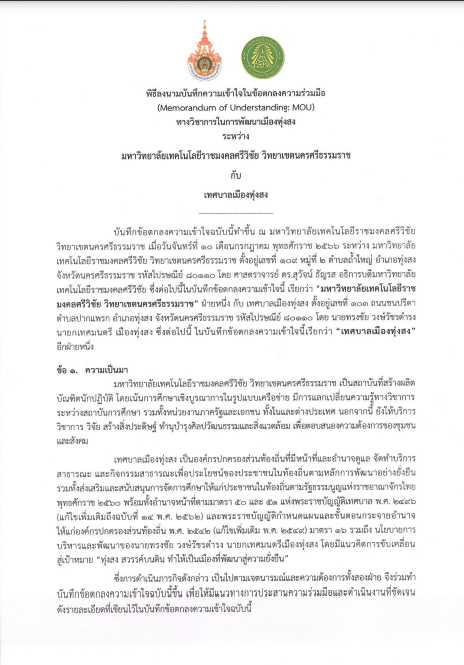 In alignment with the policy on terrestrial biodiversity conservation, Rajamangala University of Technology Srivijaya (RUTS) and Thung Song Municipality have strengthened their collaboration through a formal Memorandum of Understanding (MOU). This partnership focuses on integrating biodiversity preservation into city development strategies to promote sustainable urban growth. Under this MOU, faculty members from the Faculty of Science and Technology serve as scientific advisors, providing expertise in sustainable land use, forest management, and ecological restoration. Together, they aim to create a model city that harmonizes urban development with the protection of natural habitats. The collaboration also emphasizes the importance of education, encouraging community members to participate in local conservation programs. Workshops and training sessions are organized for students, teachers, and municipal officers to enhance their understanding of ecosystem balance and the value of native species. Through these joint efforts, Thung Song becomes a living laboratory for sustainability. The policy framework provides both guidance and momentum for translating environmental commitments into measurable conservation outcomes. Ultimately, this initiative demonstrates how academic knowledge and local governance can unite to achieve long-term ecological resilience.