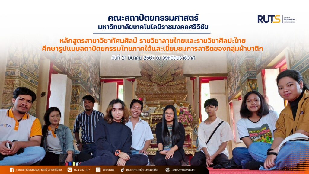 The Thai Art Program of the Faculty of Architecture, Rajamangala University of Technology Srivijaya (RUTS), led third- and fourth-year students from the courses Thai Pattern Design and Thai Art on a field study trip to Wat Chontharasinghe (Wat Phithak Phandin Thai) in Narathiwat Province.