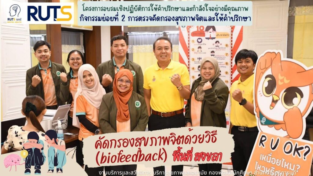 From September 4–9, 2024, Asst. Prof. Piya Prasongchan, Vice President of Rajamangala University of Technology Srivijaya, visited the activities to encourage and support staff and students participating in the mental health screenings and counseling sessions. The services were provided by the 12th Mental Health Center, Songkhla Province, and the 11th Mental Health Center, Surat Thani Province, using biofeedback methods for mental health assessment.