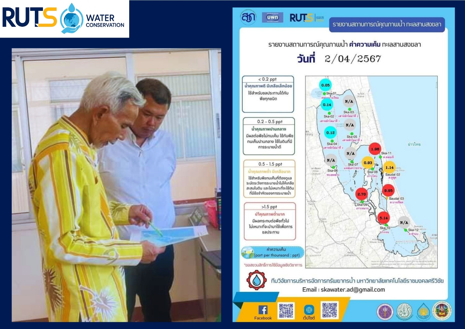 On April 1, 2024, the Water Management Research Team from the Faculty of Engineering, Rajamangala University of Technology Srivijaya (RUTS), was invited by the executives, council president, and administrators of the Khlong Ree Subdistrict Administrative Organization in Sathing Phra District, Songkhla Province, to conduct a comprehensive assessment of salinity levels in Songkhla Lake. Recent observations have indicated that salinity levels in certain areas of the lake have risen above 2 parts per thousand (ppt), creating significant challenges for the Sathing Phra Peninsula. This increase in salinity is affecting the availability and quality of domestic water resources, agricultural activities, and aquaculture production, thereby posing both environmental and socio-economic risks to local communities.