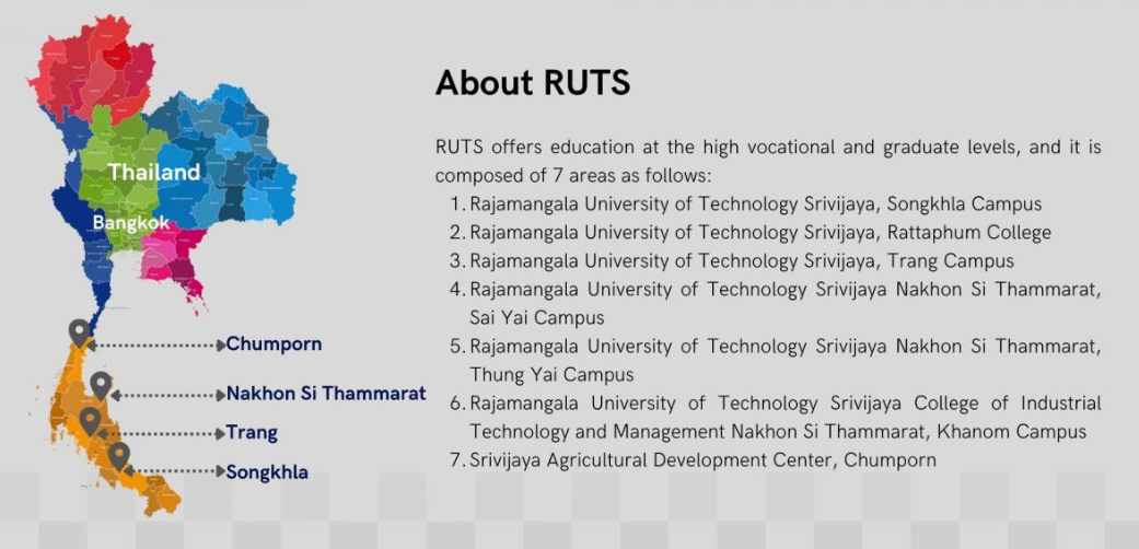Rajamangala University of Technology Srivijaya (RUTS) located in southern Thailand. It is a prominent institution within the Rajamangala University of Technology (RMUT) consortium. RUTS prioritizes the efficient management of higher education, particularly in the fields of science, technology, and services. The principal objectives are to develop graduates who have the necessary professional skills for successful professions and a deep understanding of their ethical duties in society and the nation. Moreover, RUTS has instituted policies that emphasize the enhancement of research, pedagogy, community engagement, cultural conservation, environmental sustainability, and the continuous professional development of its personnel to ensure conformity with the exigencies of a globalized society and the achievement of the university’s aspirational objectives.