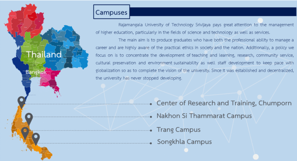 Rajamangala University of Technology Srivijaya (RUTS) located in southern Thailand. It is a prominent institution within the Rajamangala University of Technology (RMUT) consortium. RUTS prioritizes the efficient management of higher education, particularly in the fields of science, technology, and services. The principal objectives are to develop graduates who have the necessary professional skills for successful professions and a deep understanding of their ethical duties in society and the nation. Moreover, RUTS has instituted policies that emphasize the enhancement of research, pedagogy, community engagement, cultural conservation, environmental sustainability, and the continuous professional development of its personnel to ensure conformity with the exigencies of a globalized society and the achievement of the university’s aspirational objectives.