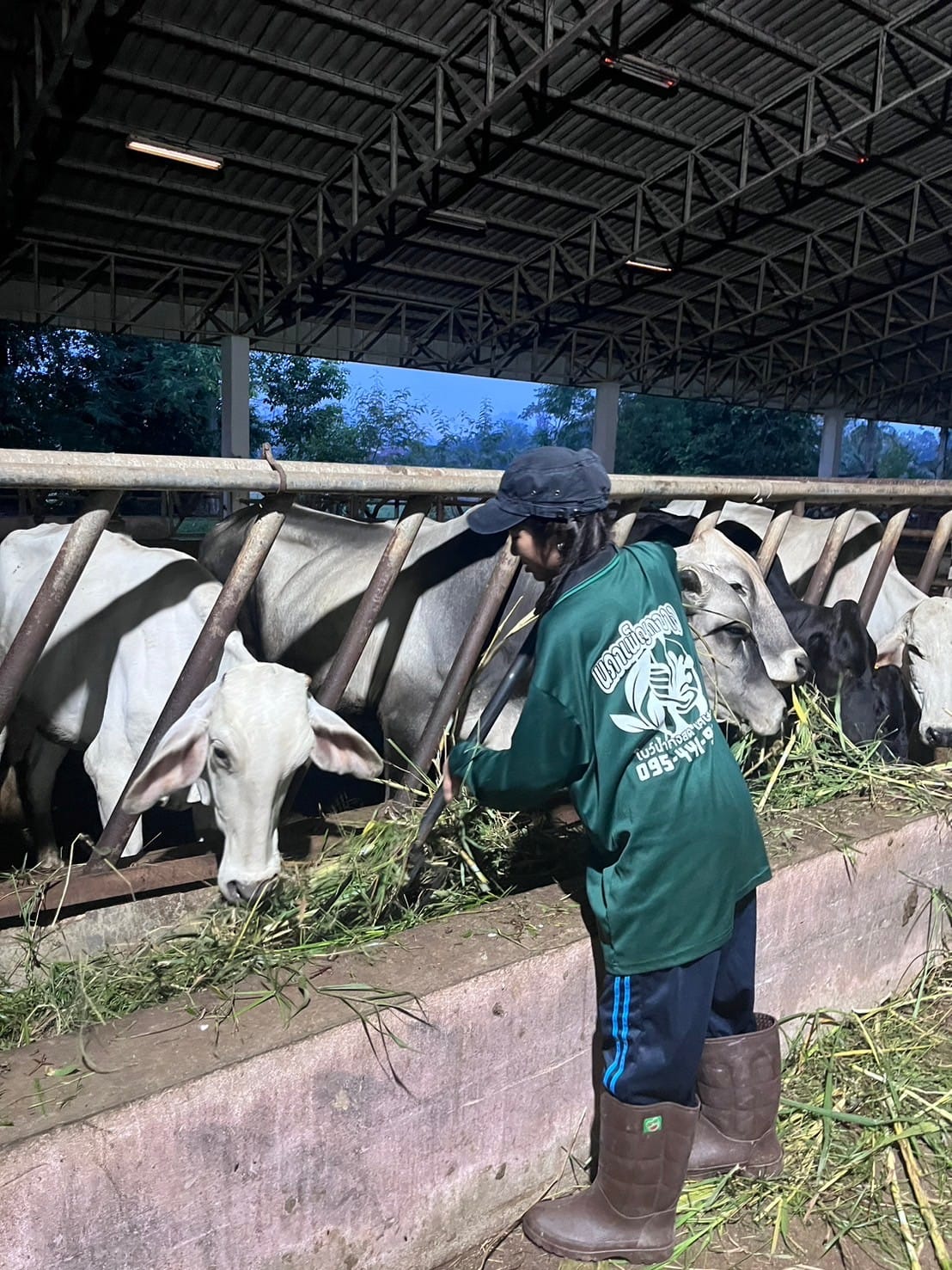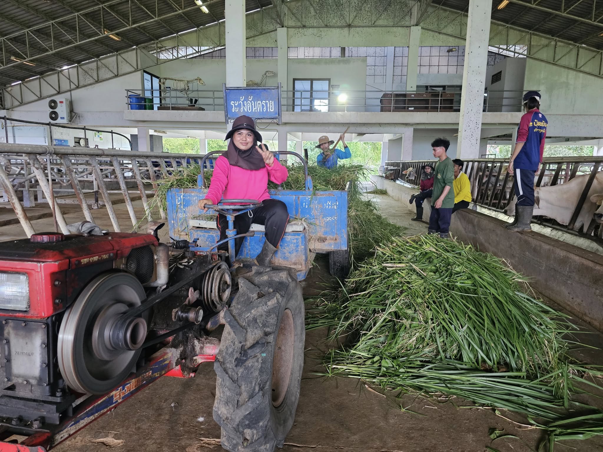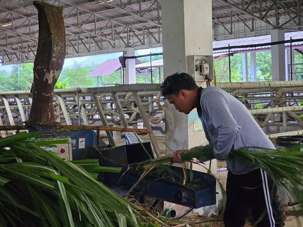 The Animal Science Program, Faculty of Agriculture, has assigned students in the courses Basic Skills in Animal Science and Specific Skills in Animal Science to conduct the preparation of Napier grass silage. The purpose of this activity is to produce a reserve feed source for beef cattle, dairy cattle, and goats during the dry season. The process is carried out as follows: The ensiling process of Napier grass involves harvesting the forage at an optimal growth stage, typically when it reaches 1.0–1.2 meters in height, to ensure a balance between yield and nutrient quality. The grass is then chopped into small pieces of about 2–3 centimeters to facilitate packing and fermentation. If the moisture content exceeds 70%, the material should be wilted under shade for several hours to reduce excess water. Molasses or other fermentable carbohydrates may be added at 3–5% of fresh weight to enhance lactic acid fermentation. The chopped grass is packed tightly into airtight silos, plastic drums, or trench pits to exclude oxygen. Proper compaction is essential to promote anaerobic conditions and prevent spoilage. The silos are sealed with plastic sheets and weighted to maintain airtightness. Fermentation typically takes 21–30 days, during which lactic acid bacteria convert sugars into organic acids, lowering the pH to about 3.8–4.2. Once fermentation is complete, the silage should have a pleasant, slightly acidic smell and retain a greenish color. Well-prepared Napier grass silage improves feed efficiency, nutrient availability, and year-round forage supply for livestock.