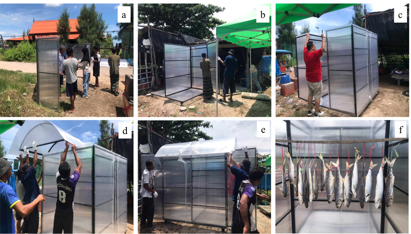 Figure 1. Solar-powered dryer: (a) components of the solar-powered dryer; (b) installation of the base and partition panels; (c) assembly of the side covers; (d) installation of the roof; (e) inspection for gaps and finishing details; and (f) fish-drying experiment using the solar-powered dryer.