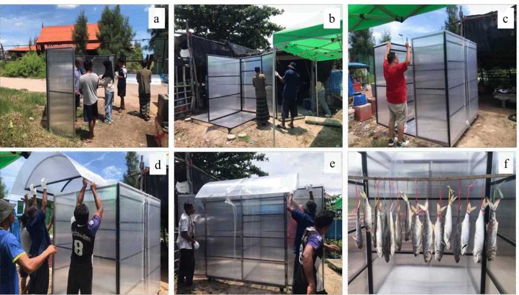 Figure 1. Solar-powered dryer: (a) components of the solar-powered dryer; (b) installation of the base and partition panels; (c) assembly of the side covers; (d) installation of the roof; (e) inspection for gaps and finishing details; and (f) fish-drying experiment using the solar-powered dryer.
