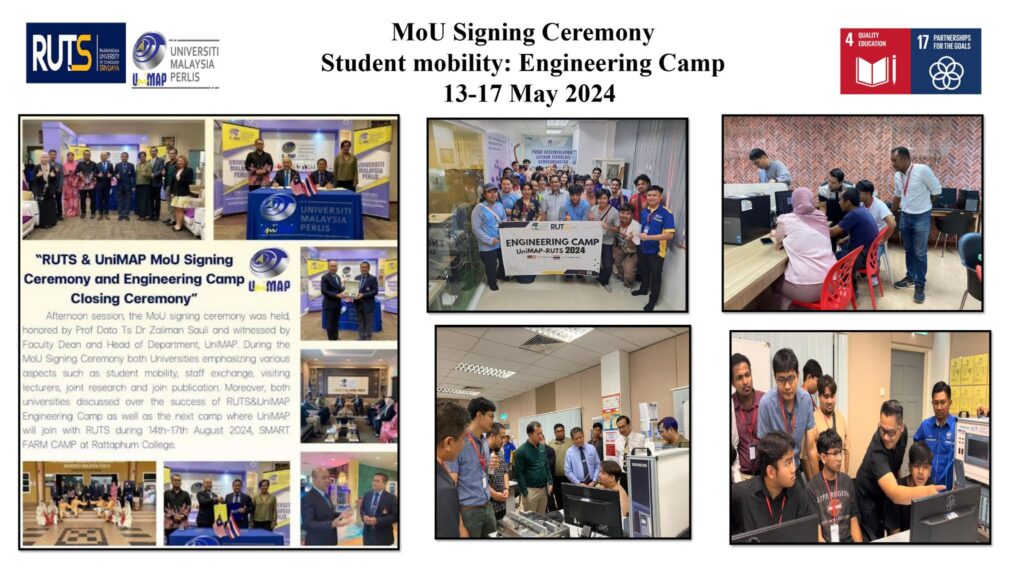 In 2024, RUTS collaborates with University in Malaysia as Universiti Malaysia Perlis (UniMAP), Malaysia to focus on how universities can collaborate and review action to build best practice to relate to SDG 1 to 17. For instance, during 13-17 May 2024, Asst. Prof. Dr Thanwit Neamsai , RUTS Lecturer in Engineering as Engineering leader Camp, together with 4 RUTS lecturers in Engineering and 30 RUTS Engineering students did participated the RUTS & UniMAP International Engineering Camp 2024. The opening ceremony was hosted and welcomed by Assoc. Prof. Ts. Dr. Siti Khadijah Zaa’ba ,Dean of Faculty of Electronic Engineering & Technology. Duration of the programme was for a 5-days period and Thirty five of RUTS participants and Thirty- five of UniMAP participants did participate the programme. The programme focused on three activities including academic workshop, cross-cultural performance exchange and sport activities. For academic workshop perspective, this programme focused on learning and practical skills, especially Microbit/Siemens PLC. For Cultural activities, this programme focused on Thai-Malaysian Tradition Dance & Costumes, Thai-Malysian Marterial Arts & Tanjak as well as Thai-Malaysian Traditional Song. For sport activities, this programme focused on Woodball and Football playing. In conclusion, the RUTS & UniMAP Engineering Camp 2024 had a significant impact on participants by enhancing SDG-oriented engineering competencies, cross-cultural collaboration, and innovation. Students demonstrated improved problem-solving abilities and consciously applied SDG principles including SDG 6, 7, 9 and 12 in project design, particularly in clean energy, sustainable infrastructure, and resource management. Furthermore, the camp strengthened academic collaboration between Thailand and Malaysia, providing a foundation for future joint initiatives and sustainable curriculum development. This study underscores the value of experiential, international learning programs in preparing engineers capable of addressing global sustainability challenges while fostering socially responsible. In addition, on 16th May 2024, Prof. Dr Suwat Tanyaros, the President, RUTS representatives and Prof.Dato.Ts.Dr Znliman Sauli, the Vice Chancellor did preside over the Memorandum of Understanding (MoU) signing ceremony between RUTS and UniMAP for Partnership for the Goals.