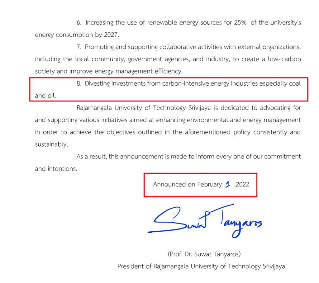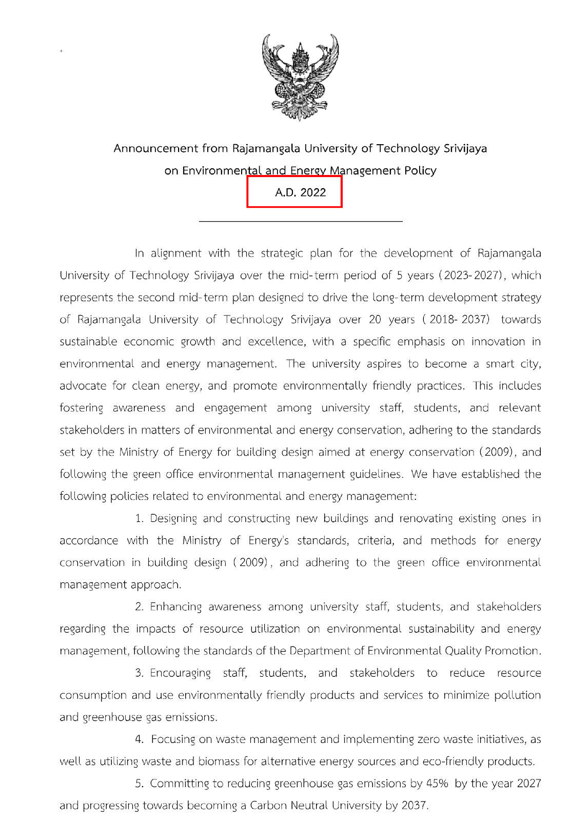 Rajamangala University of Technology Srivijaya (RUTS) recognizes the urgent need for global action to address climate change and its far-reaching impacts on ecosystems, communities, and future generations. As an institution committed to sustainable development, environmental responsibility, and alignment with the United Nations Sustainable Development Goals (SDGs), RUTS continues to take decisive steps to ensure that its financial practices reflect and reinforce its academic values, research priorities, and long-term sustainability vision.