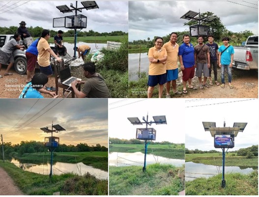 3) Designing and installing monitoring instruments: The automatic salinity and rainfall meter was developed and installed to record real-time data on salinity, temperature, humidity, and rainfall, accessible through the LINE application. The RUTS team also provided training on wet-dry rice cultivation to help reduce water demand and offered guidance on maintaining the monitoring equipment. As a result, government agencies and agricultural groups were able to receive salinity readings every two hours, apply water-saving practices, and independently maintain the salinity monitoring device.