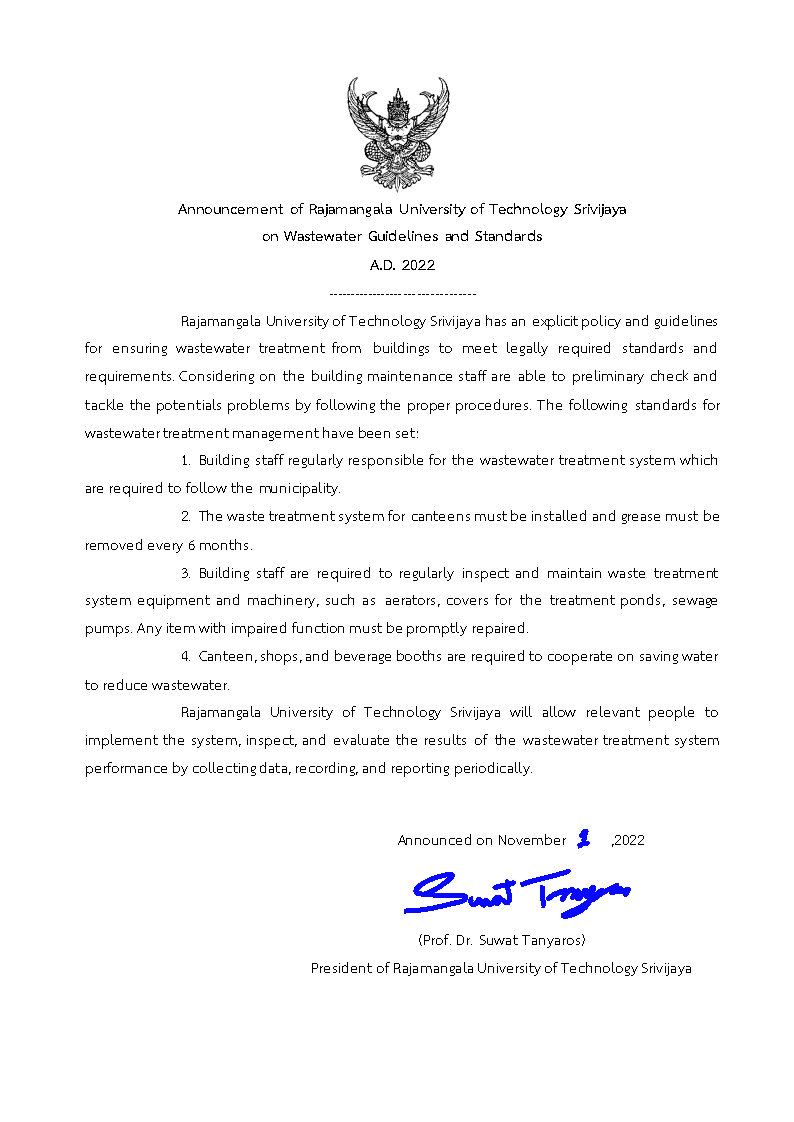 Rajamangala University of Technology Srivijaya (RUTS) complies with the regulation of the Ministry of Natural Resources and Environment A.D. 2548 as explicit policy and guidelines for implementing management in reduction and separation system of wastewater treatment from university buildings and canteens.