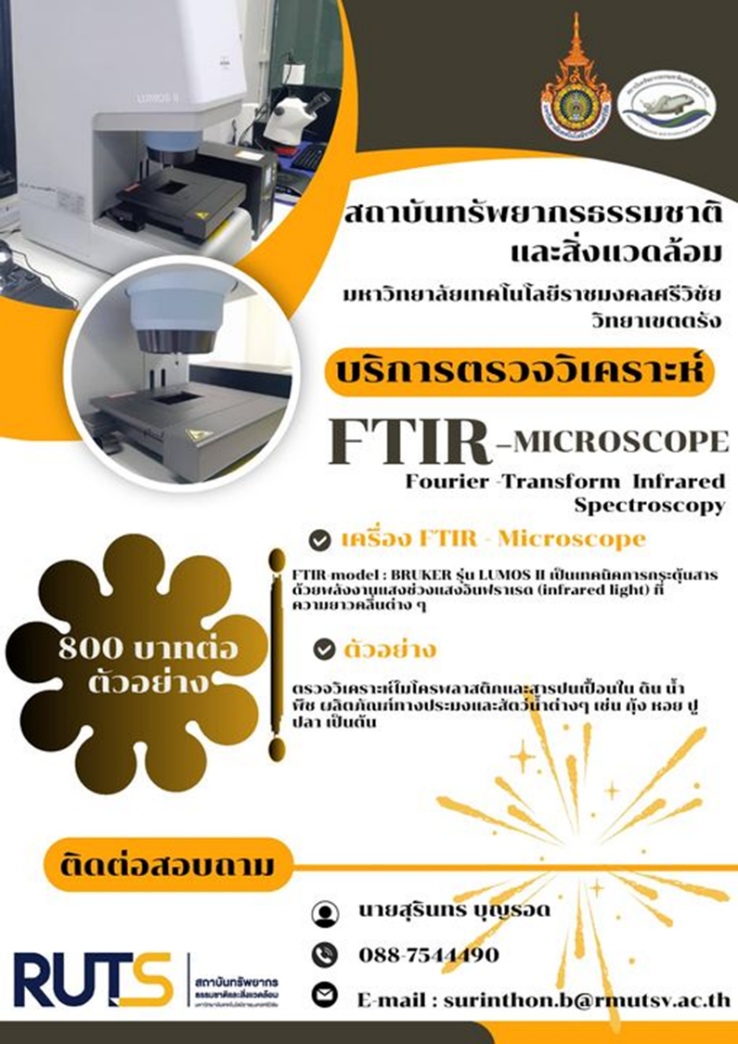 To address this issue, RUTS established a Microplastic Monitoring Laboratory in 2021, equipped with a BRUKER LUMOS II FTIR Microscope for analyzing microplastic contamination in coastal ecosystems. The laboratory focuses on species such as shrimp, shellfish, crabs, fish, aquatic plants, and fishery products in Trang Province, supporting RUTS’s broader mission to assess aquatic ecosystem health.