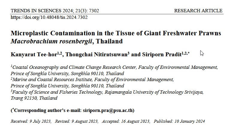 In collaboration with leading Thai universities, including Prince of Songkla University (PSU), RUTS researcher investigates microfiber contamination in giant freshwater prawn tissues from the Trang River in southern Thailand, with results published in peer-reviewed journals.