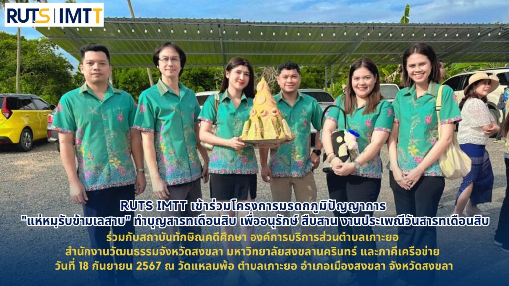 On September 18, 2024, representatives from the Office of Innovation Management and Technology Transfer, RUTS, led by Assoc. Prof. Worapong Boonchuaytan, participated in the “Hae Marap Kham Lesap: Heritage of Wisdom” festival – an annual cultural celebration of the Sart Duan Sib (Tenth Lunar Month Merit-Making Festival) in Songkhla.