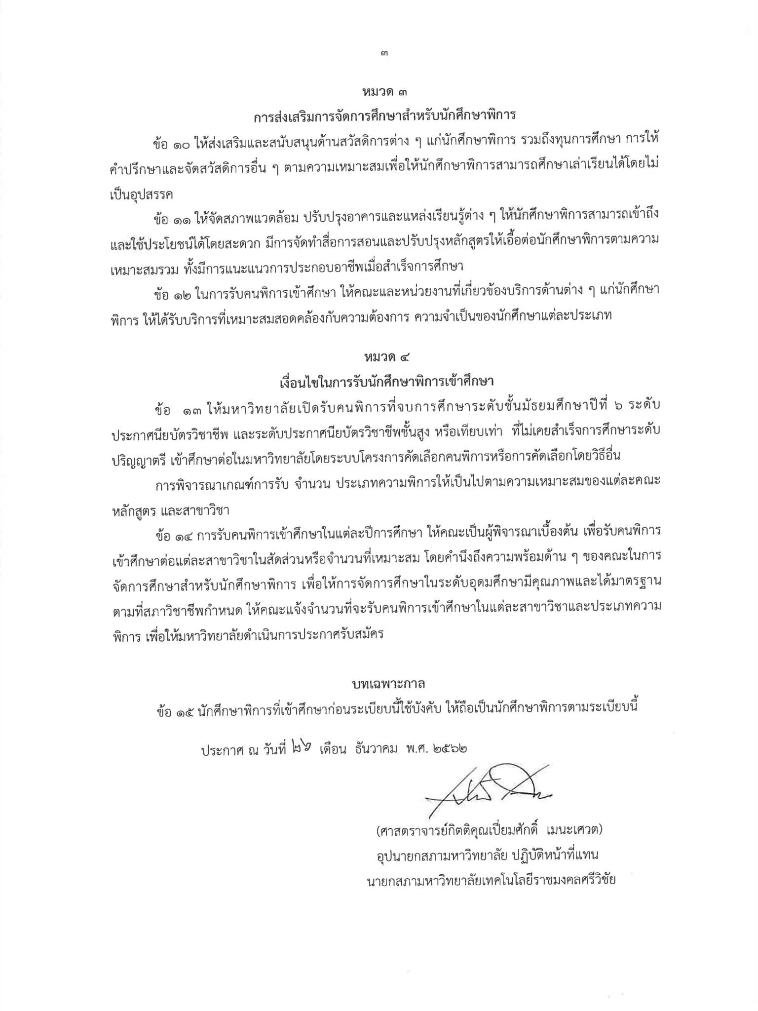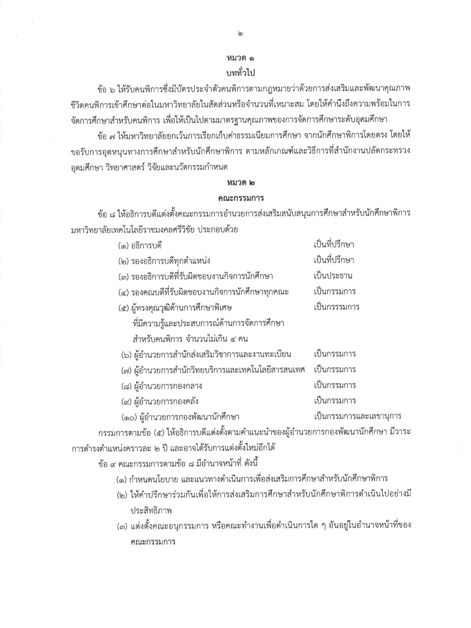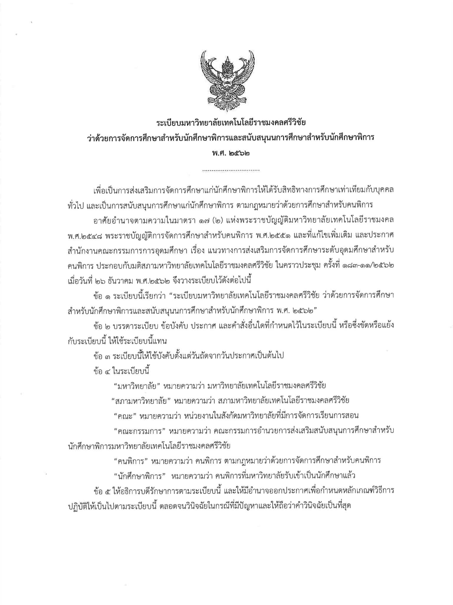 Rajamangala University of Technology Srivijaya implements regulations concerning educational management and support for students with disabilities B.E. 2562 (2019). These regulations govern the admission of persons with disabilities who possess legal disability identification cards, accepting them in appropriate proportions while considering the university’s readiness to provide education for disabled students. The regulations waive direct educational fees from these students, instead receiving educational subsidies for disabled students.