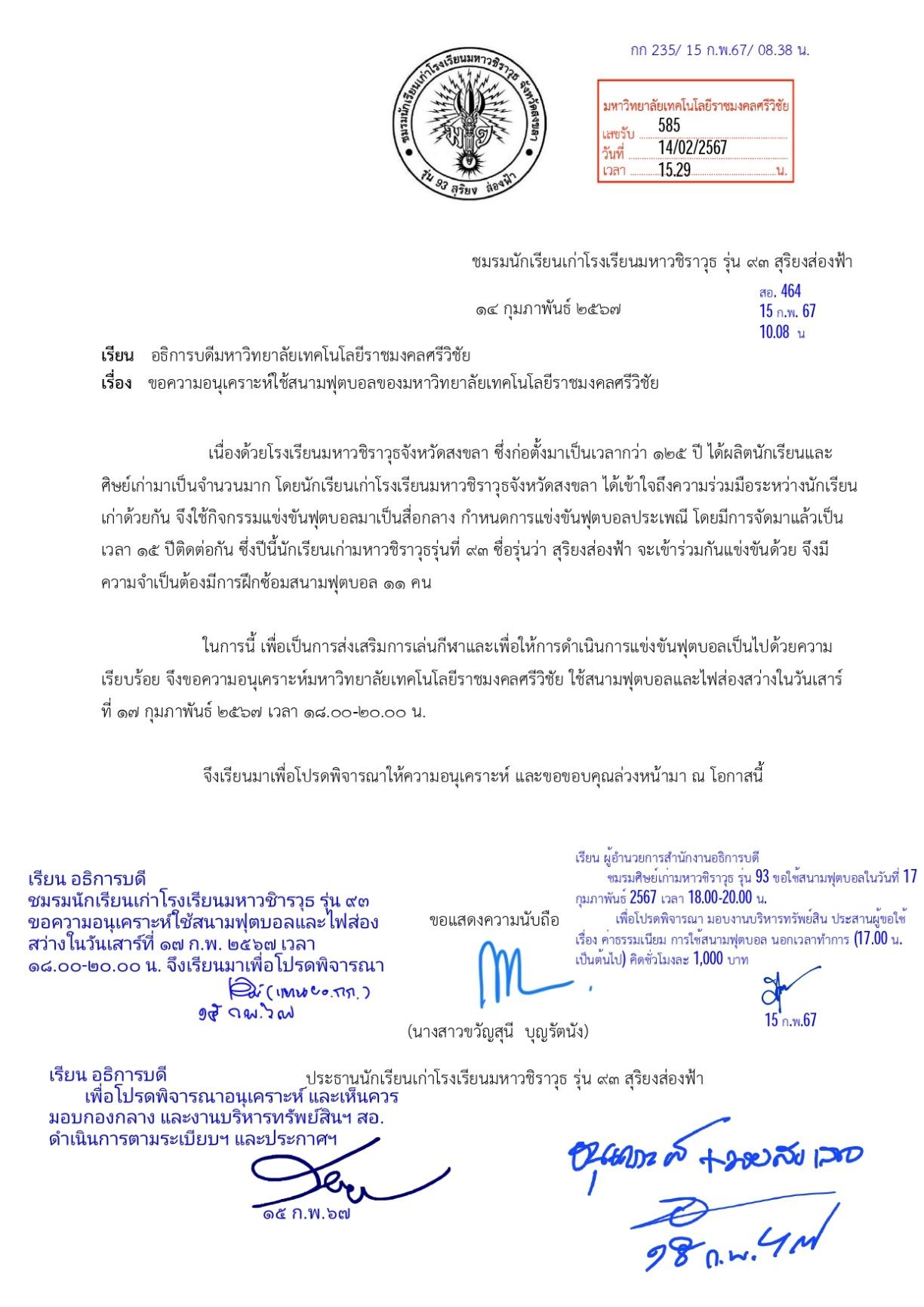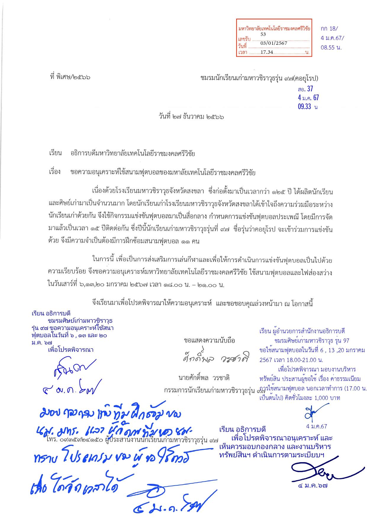 On January 6, 13, and 20, 2024, and February 17, 2024, the university provided its football field for use by the Maha Vajiravudh School Alumni Association (Class of 1993 “Suriya Song Fah”), to organize football matches that serve as a bridge between current students and alumni.