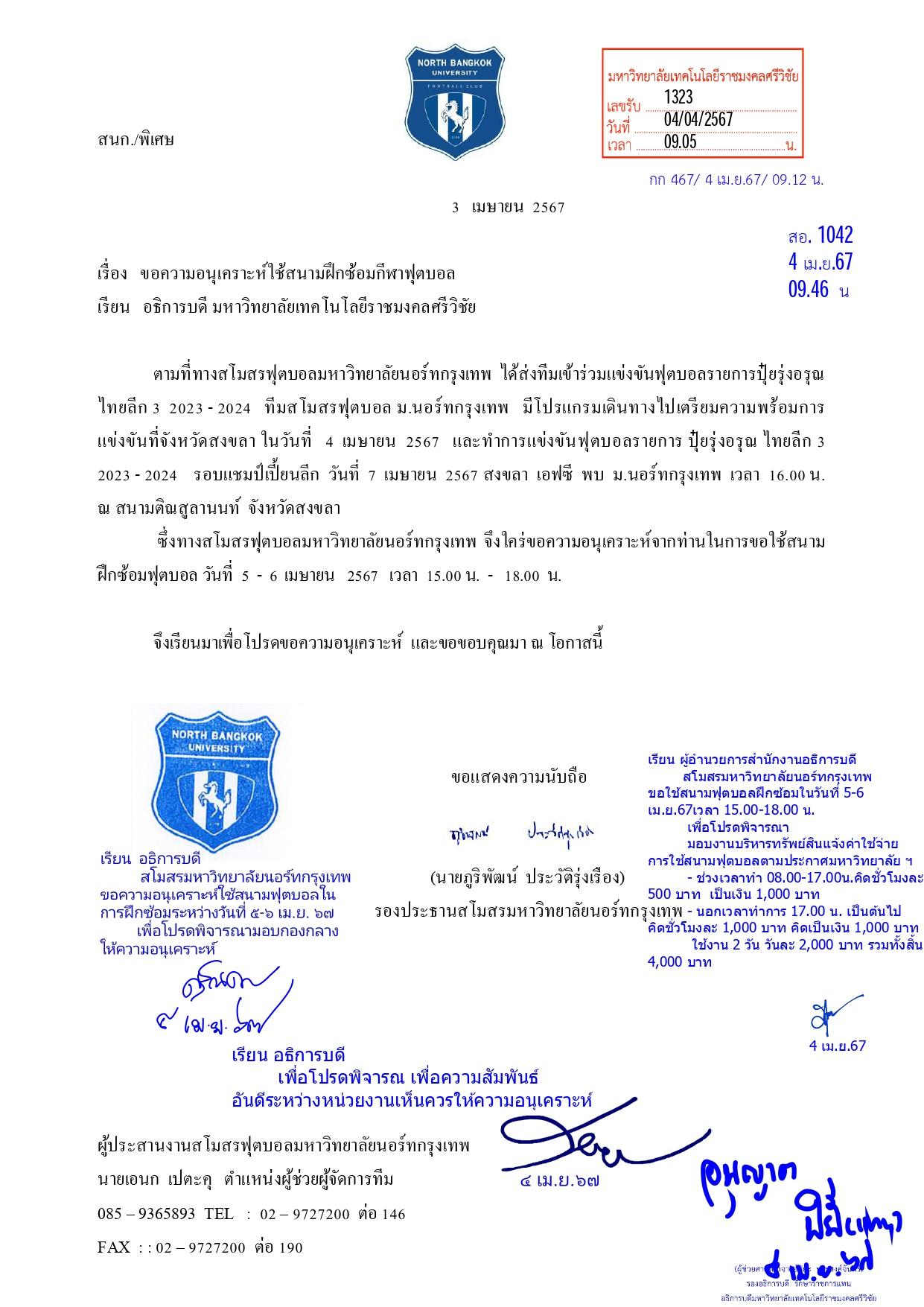 On April 5–6, 2024, the university also provided its football field for North Bangkok University to practice for participation in the Thai League 3 “Rung Arun” football competition.