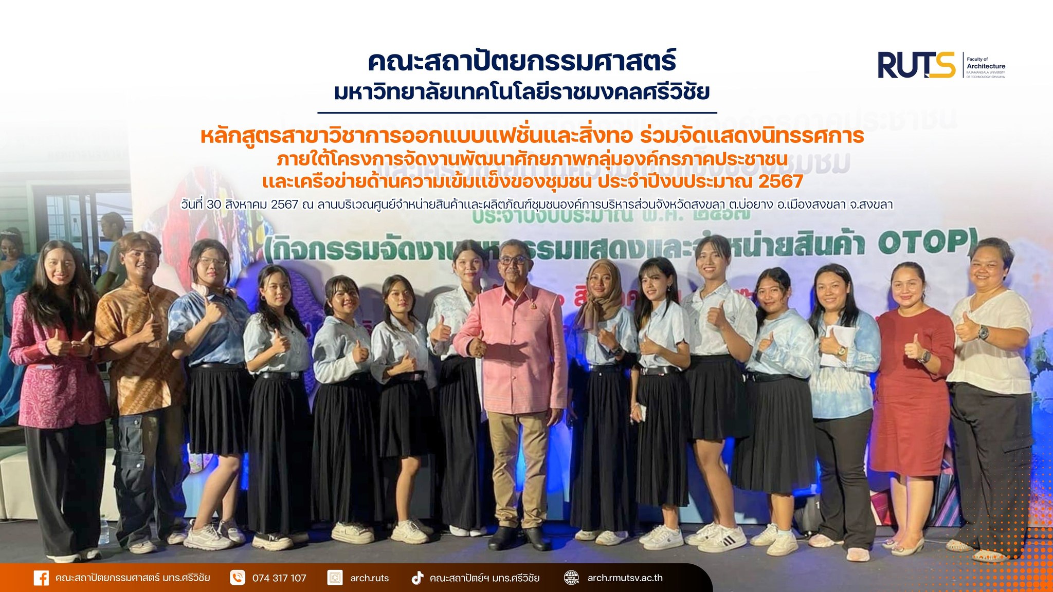 Faculty members and students from the Fashion & Textile Design Program, Faculty of Architecture, RUTS, in collaboration with the Songkhla Provincial Administrative Organization (PAO) under its Social Welfare Division, organized an exhibition of works