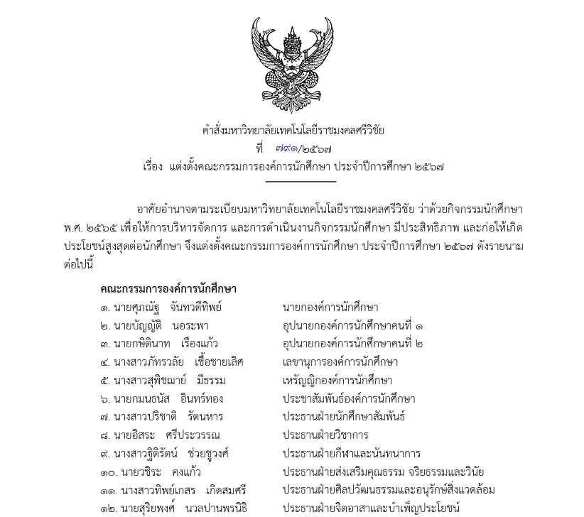 - Review and plan the operations of the Student Organization in alignment with the objectives outlined in the Rajamangala University of Technology Srivijaya’s Student Activities Regulation of 2022.