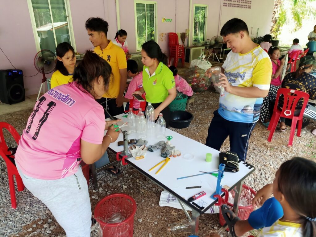 On January 9, 2024, an integrated study visit group from the Sikao District Learning Promotion Center participated in a knowledge transfer and hands-on training activity on environmental conservation: “Transforming Plastic Bottles into Brooms” at the Southern Royal Initiative Waste and Wastewater Management Technology Transfer Center. The activity aimed to equip participants with practical skills that could be applied to improve their quality of life and promote self-reliance. A total of 15 participants joined the session, representing three subdistricts—Mai Fat, Bo Hin, and Na Mueang Phet, Trang Province.