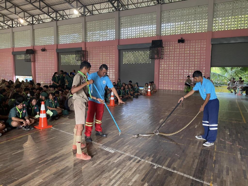 Hands-on learning activities were included to make the session more engaging. Students practiced safe observation techniques, such as using long sticks or maintaining a proper distance during field simulations. They also learned basic first-aid responses for snakebite victims and how to contact local authorities or rescue teams. These practical lessons were designed to prepare them for real-life encounters in rural areas where snake sightings are common. At the same time, students discussed how they could share this knowledge with their families and communities, turning education into community empowerment. Dr. Worawitoo emphasized that coexistence with snakes is possible when people respect their ecological importance and act with awareness rather than fear. This program not only enhanced students’ scientific understanding but also inspired them to become young ambassadors for sustainable ecology. By fostering compassion and responsibility toward wildlife, the project contributed to building a generation that values both human safety and environmental harmony. Ultimately, the activity at Thachang Wittaya School served as a meaningful example of how education can transform attitudes, reduce conflicts, and strengthen the connection between people and nature.