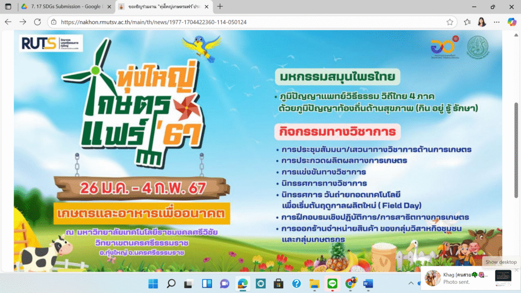 Rajamangala University of Technology Srivijaya (RUTS), Nakhon Si Thammarat Campus, organized the “Thungyai Agriculture Fair 2024” from January 26 to February 4, 2024, under the theme “Agriculture and Food for the Future.” The fair was designed as an open public learning platform that connected university experts, researchers, students, farmers, and community members in the shared mission of advancing agricultural knowledge, food innovation, and sustainable practices. Activities included academic seminars on agricultural sciences, product and innovation competitions, youth academic contests, live demonstrations of agricultural and food-technology innovations, Field Day knowledge-transfer sessions for the new planting season, and exhibitions highlighting Thai herbal medicine and local health wisdom.