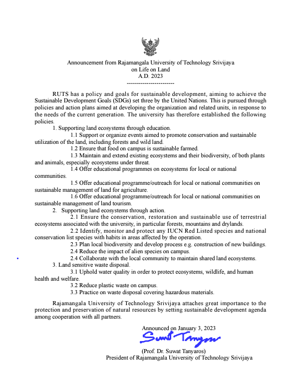 These efforts highlight RUTS’s strong commitment to environmental protection and sustainable waste management. Through projects that combine education, research, and community engagement, the university successfully reduces plastic waste, supports local environmental stewardship, and nurtures environmental responsibility among students. Together, these initiatives embody RUTS’s policy to reduce plastic waste and contribute to the global mission of sustainable ecosystem conservation under SDG 15.4.2.