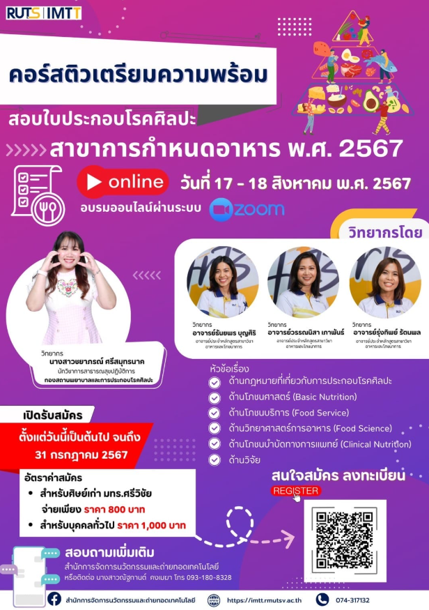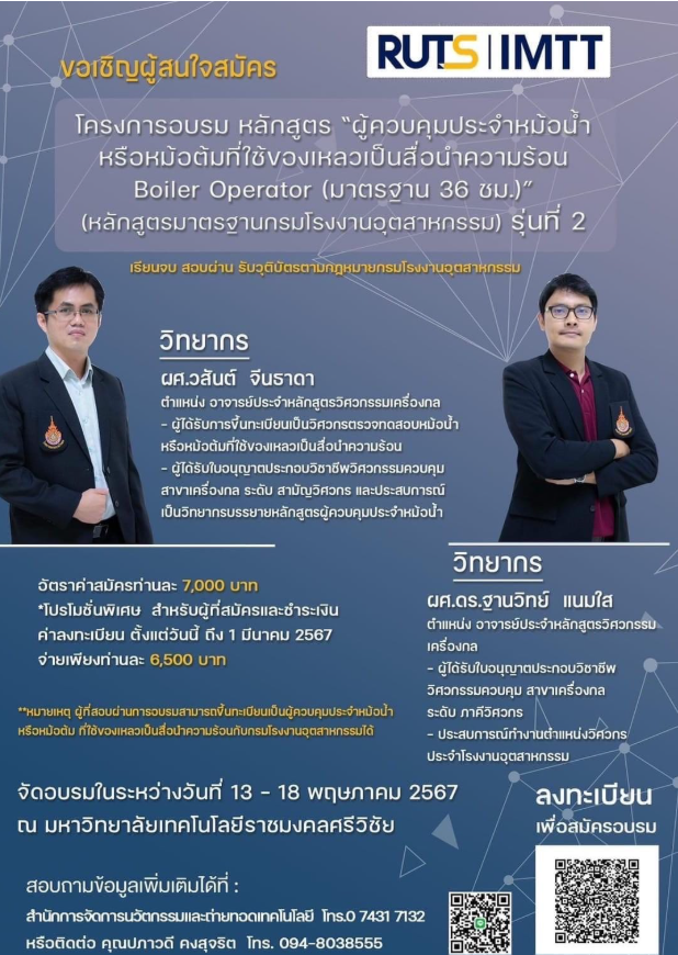 Throughout 2024, Rajamangala University of Technology Srivijaya (RUTS) implemented a series of vocational training programs aimed at enhancing public skills and expanding educational opportunities for lifelong learning. The university, through its faculties and the Innovation and Technology Transfer Management Office, organized both free and paid training courses to serve diverse groups of learners. These included Course 1: “Presentation Techniques Using Canva Level 3”, which equipped participants with creative digital design skills for professional presentations without requiring prior graphic design experience; Course 2: “Boiler Operator Training Program (Liquid Heat Transfer System)”, a 36-hour standard course designed to certify boiler operators, maintenance technicians, and engineers in safety and system operation; and Course 3: “Preparation Course for Professional Licensing Examination in Diet Therapy”, supporting learners in preparing for the Dietetic Professional Board examination to qualify for professional diet therapy practice.