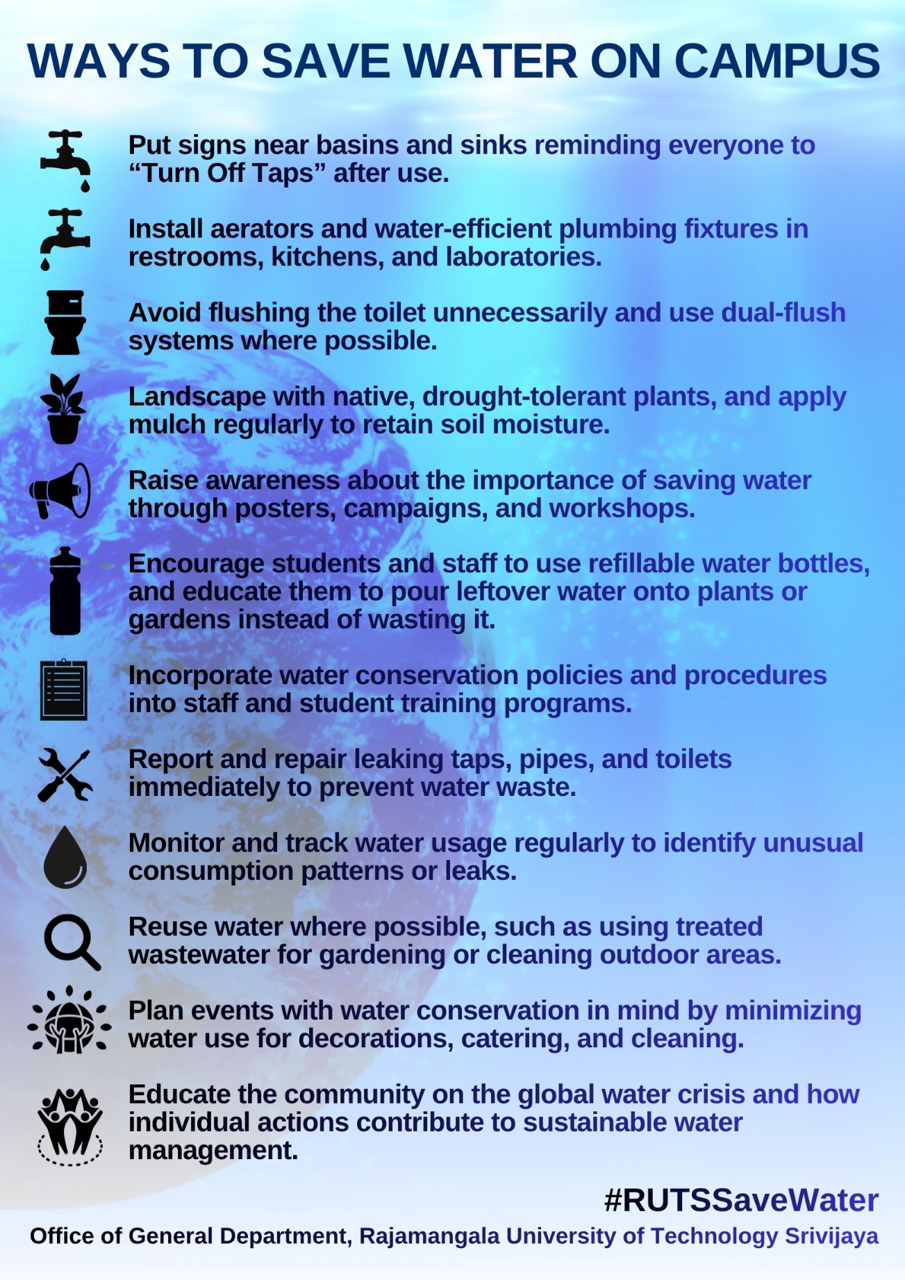 Rajamangala University of Technology Srivijaya (RUTS) has established a clear policy in compliance with the regulations of the Ministry of Natural Resources and Environment (B.E. 2548) to effectively manage, reduce, and separate wastewater generated from university buildings and canteens. To support this policy, the university has implemented a comprehensive on-site wastewater treatment system that combines both engineering solutions and biological methods to ensure sustainable and environmentally responsible water management.