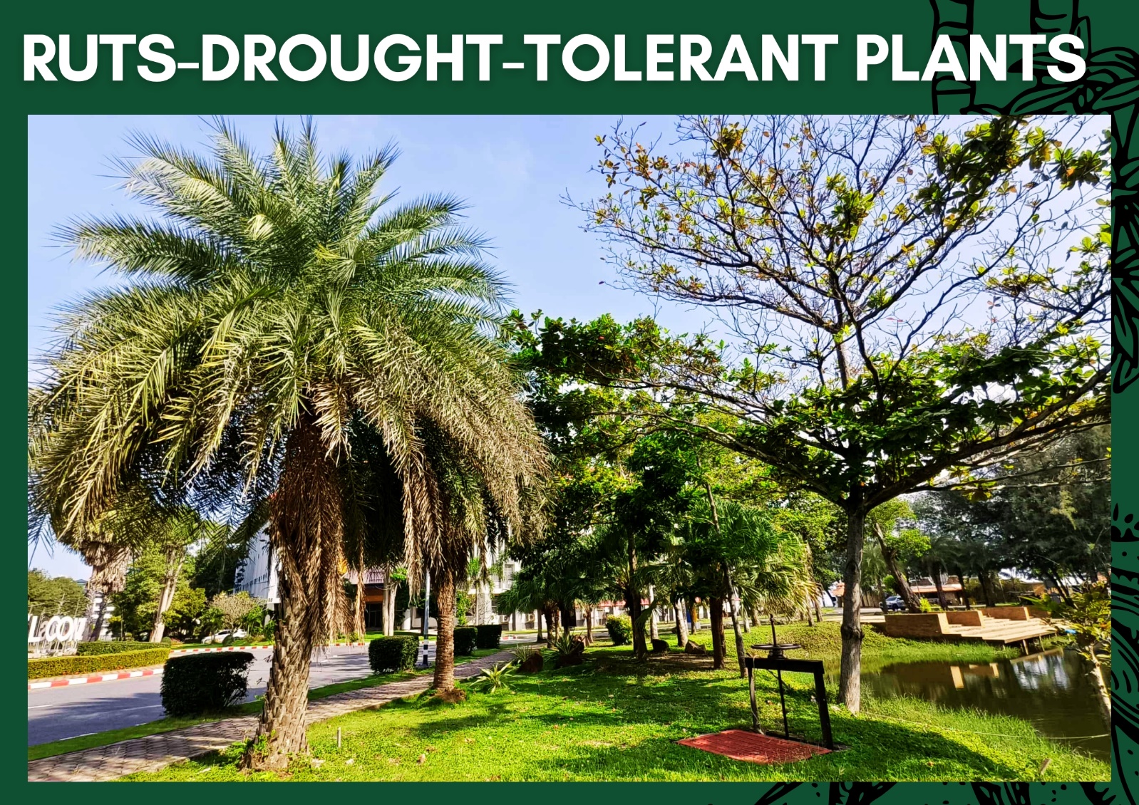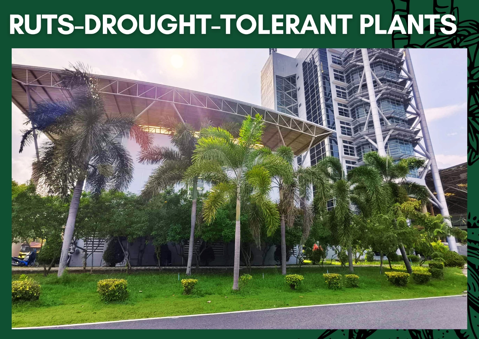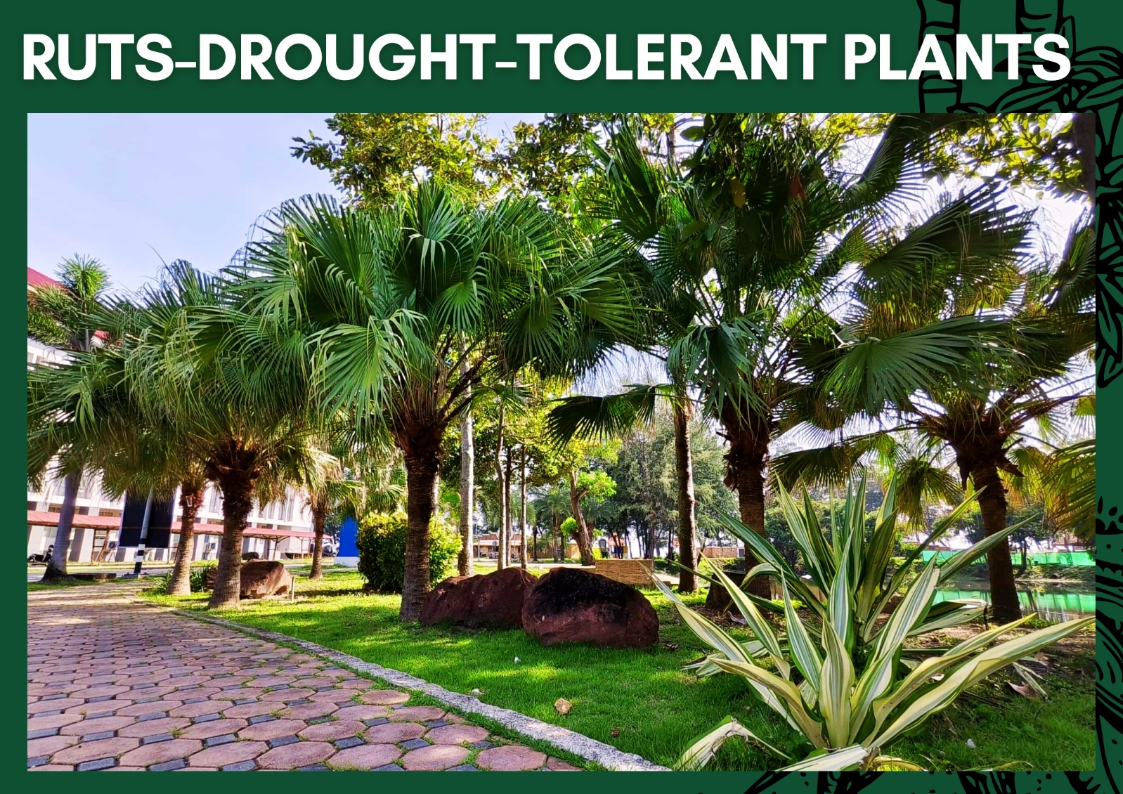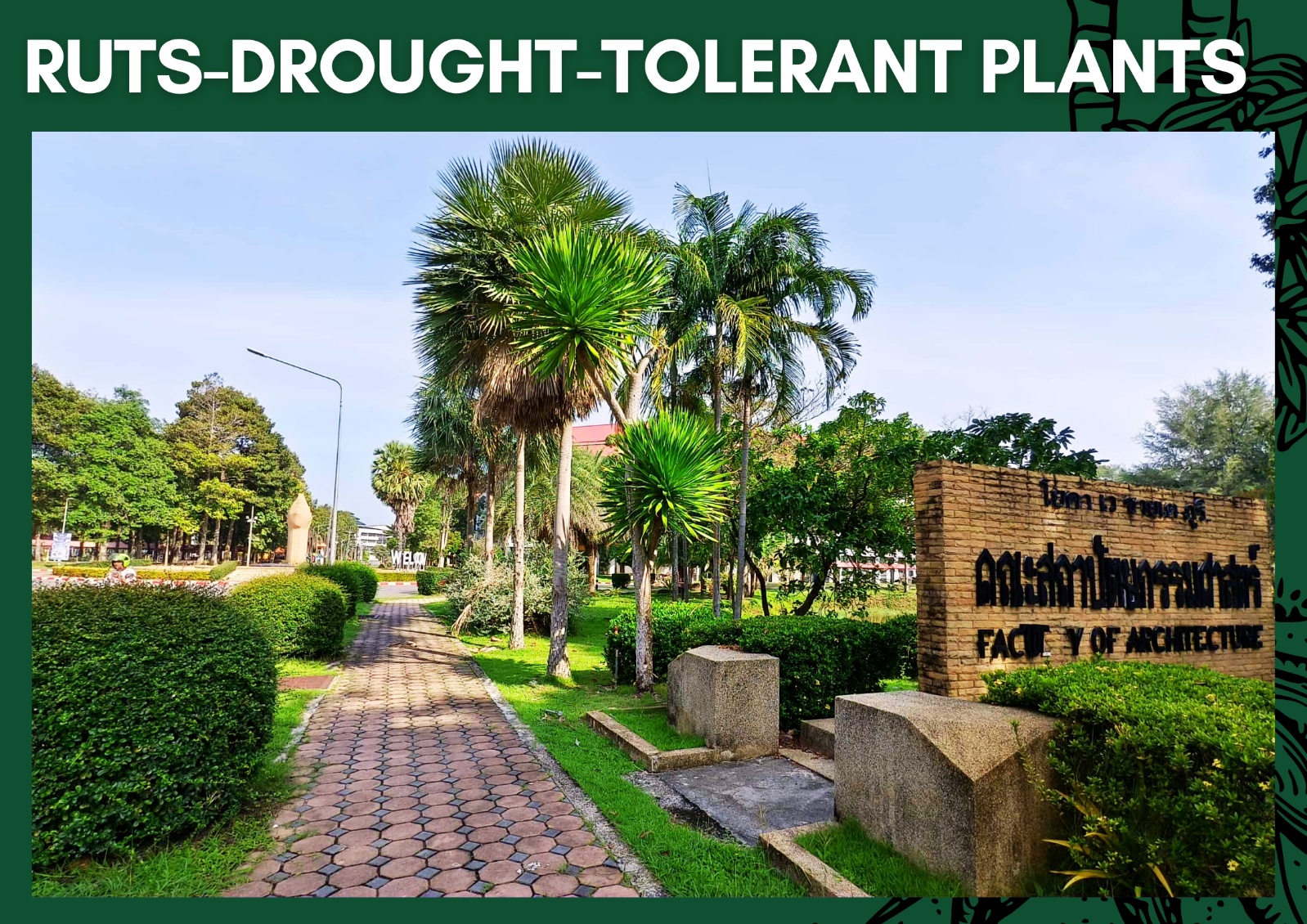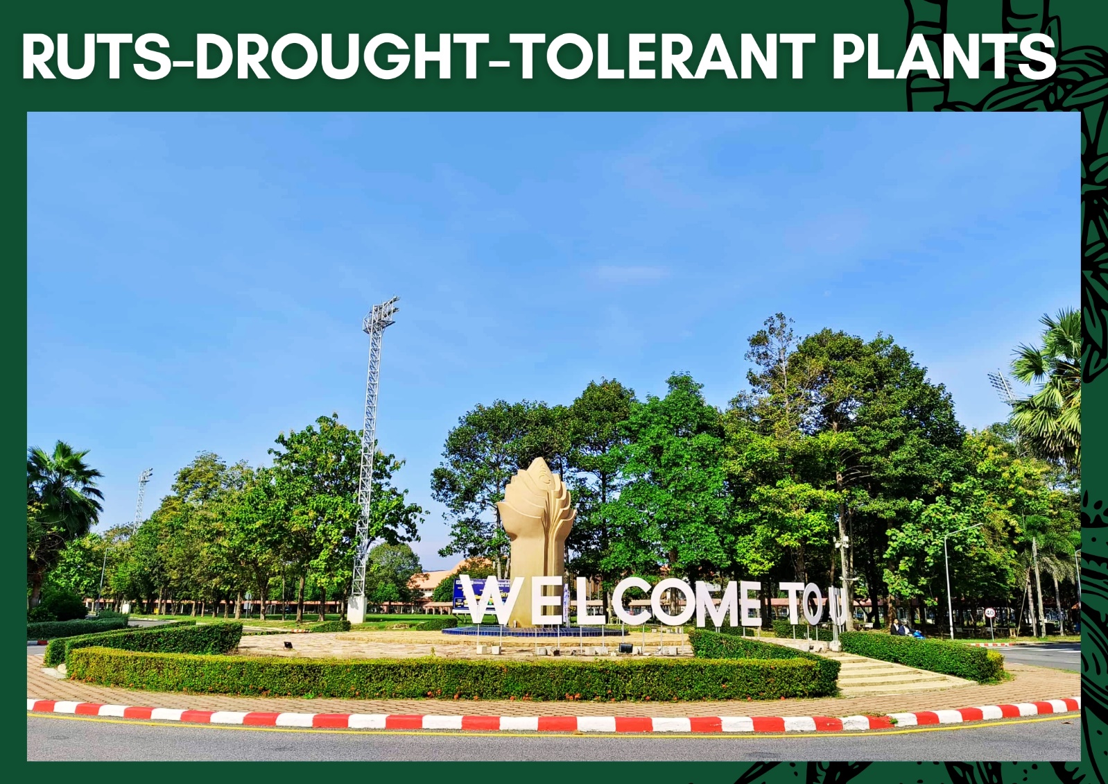 RUTS carefully selects plant and tree species that are both native to the local climate and drought-resistant, ensuring that the campus landscapes are not only visually appealing but also environmentally resilient. Native plants are well-adapted to local weather conditions and soil types, requiring minimal irrigation and maintenance. Examples include species from the palm family (Arecaceae), which thrive in dry conditions, and drought-tolerant shrubs such as Yellow Bells (Tecoma stans), Fukien Tea (Carmona retusa), and Golden Leave (Ficus microcarpa L.f.). Additionally, flowering plants like Madagascar periwinkle (Catharanthus roseus) are utilized for their hardiness and vibrant colors, adding beauty while minimizing water use.