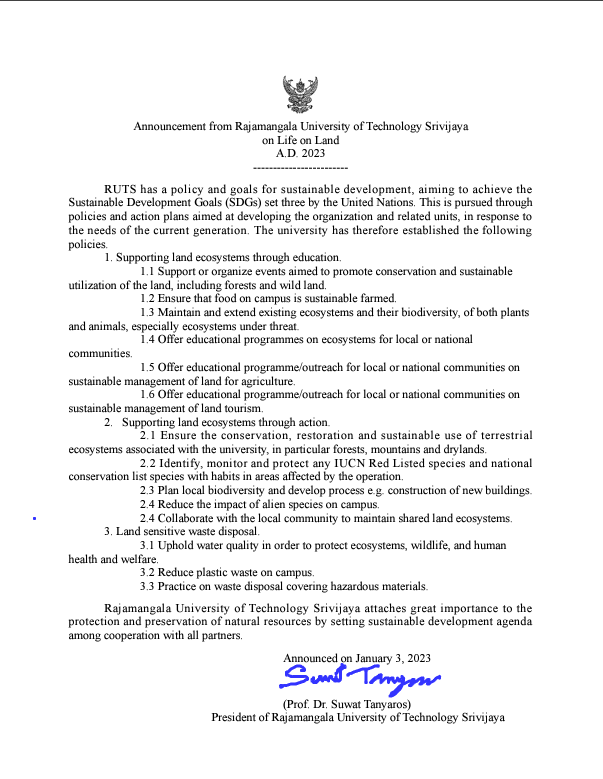 Rajamangala University of Technology Srivijaya (RUTS) has established comprehensive institutional policies that integrate sustainable land management principles into its academic programs, directly supporting SDG Target 15.3 on sustainable use, conservation, and restoration of terrestrial ecosystems. These policies ensure that future agricultural professionals are equipped with knowledge and practical skills to address land degradation challenges and promote sustainable agricultural practices.