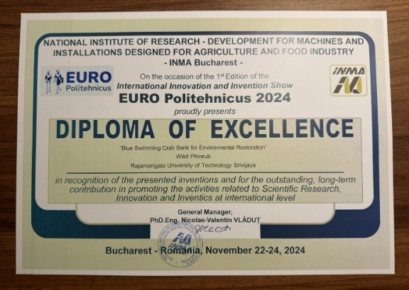 In conclusion, RUTS Crab Bank Project, the invention and innovation titled “Blue Swimming Crab Bank for Environmental Restoration” was submitted to the international exhibition and competition, EURO POLITEHNICUS 2024, held in Bucharest, Romania from November 22–24, 2024. The project earned high recognition, receiving a Gold Medal for outstanding innovation and two Excellence Awards for exceptional achievement.